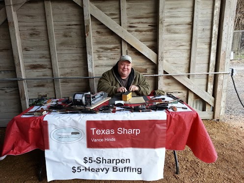 Several people said that they would be back with their knives and scissors. I intend to be at the Farmer’s Market sporadically when there is not a local gun show going on. This weekend I am moving to a bigger show. I will be at the First Monday Trade Days in Canton. I will be in the outside reserve section, row 100, lots 105 and 106, in the City area. Come see me in Canton. My son Don and bull dog Fifi will be with me. I hope to see you there.