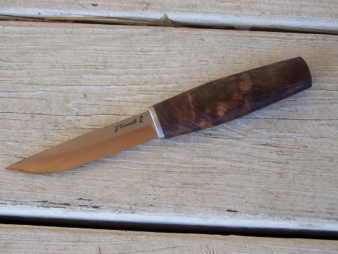I met Jim Crowell at either Warren Osborne’s First Cutting School or at the ABS Hammer In, I can’t remember which. He made a lasting impression on me. He is a true renaissance man. He has been an American Bladesmith Mastersmith for 25 years. He was one of the original teachers at the Bill Moran School of Bladesmithing in Washington, Arkansas. He is truly the Mastersmith’s Mastersmith. He makes a beautiful knife and has several cutting competition champion awards to his credit. When I saw that he had made a set of instructional videos, I had to repost them. If anyone is new to knifemaking or bladesmithing, this is the set to buy. I wholeheartedly endorse his DVDs. I have great respect for Jim Crowell. Here are some examples of his work: