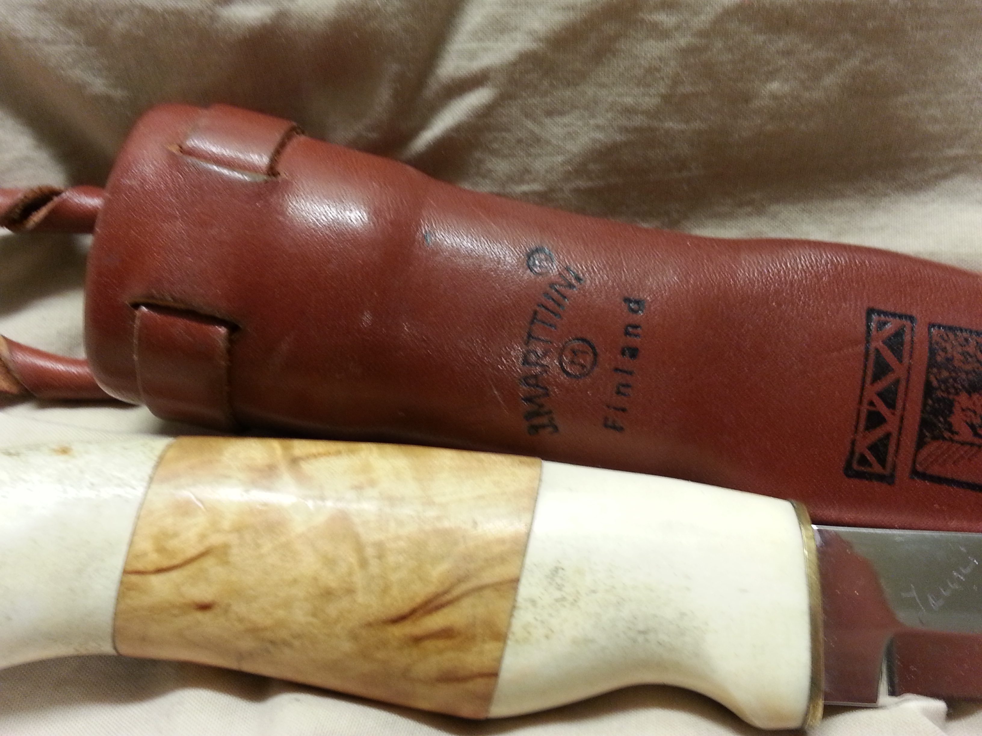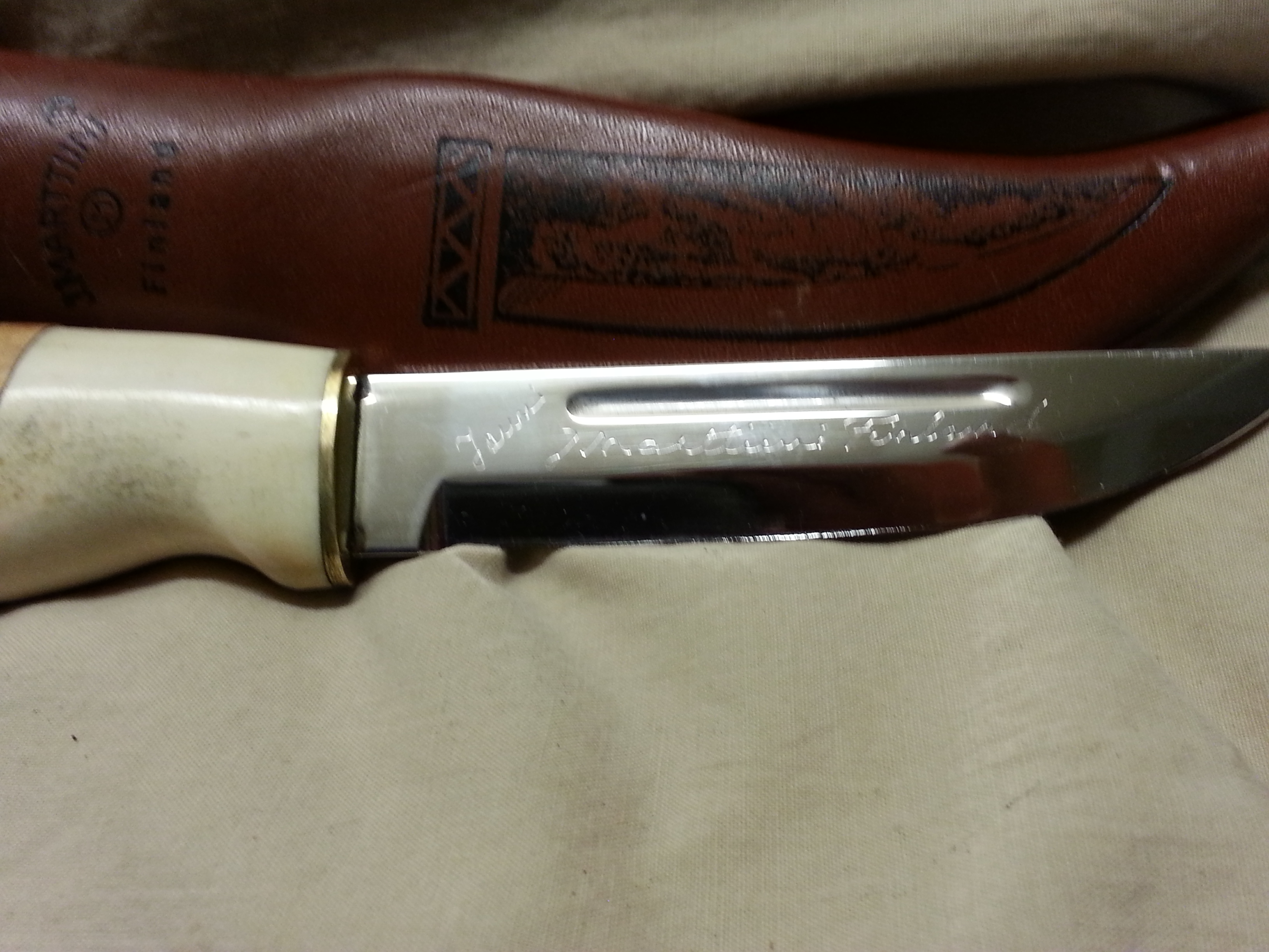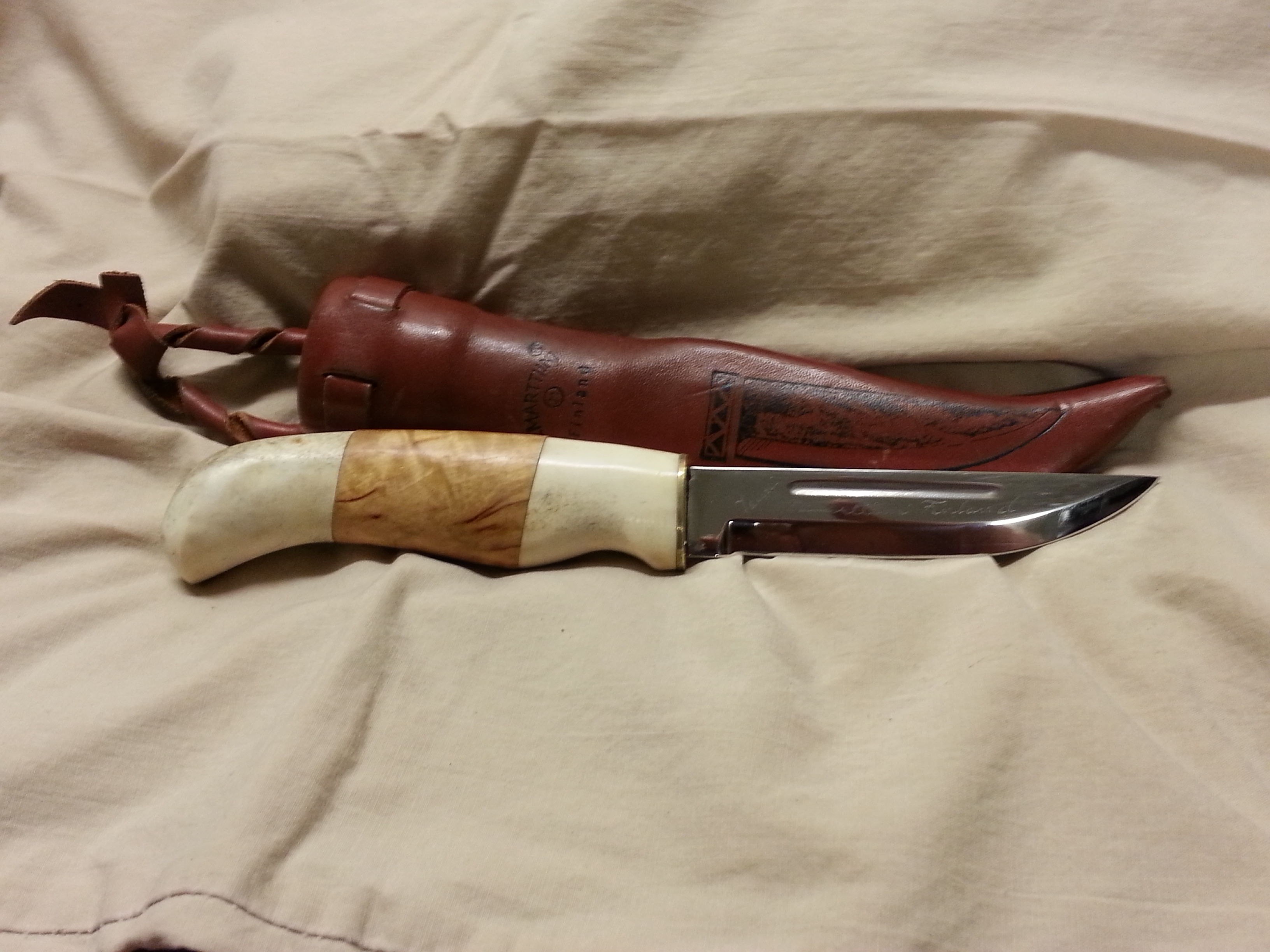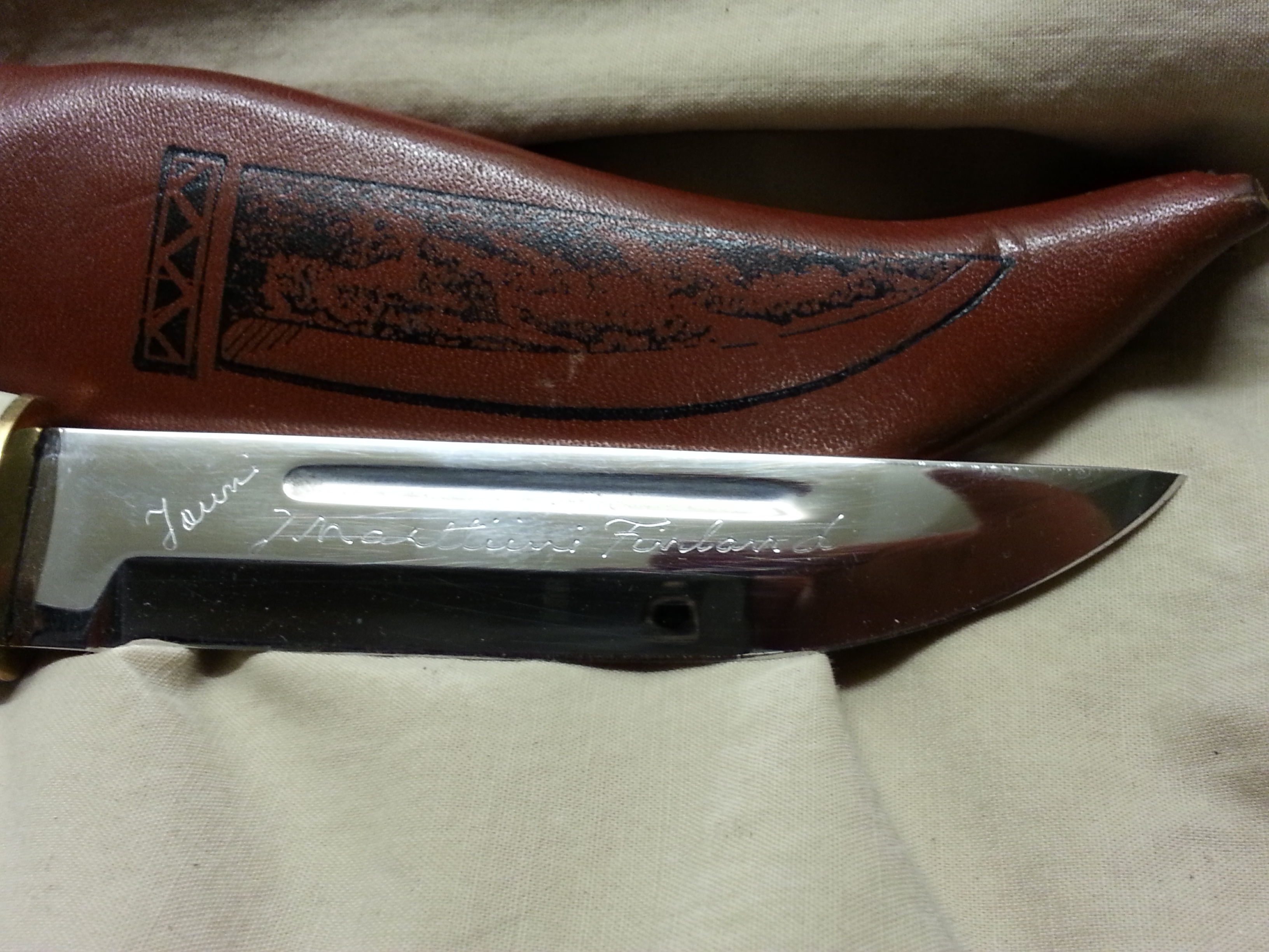 Description: This special model of a Finn puuko knife was designed by Jouni and given his name and includes a blood groove. This knife is hard to find. I would let it go for $100.00. It is in my personal collection and I intended to put it through the tests this deer season. It feels great in the hand. I was told when I bought the knife that it was laminated steel but could not verify that in my research. I will post some more pictures above as well.