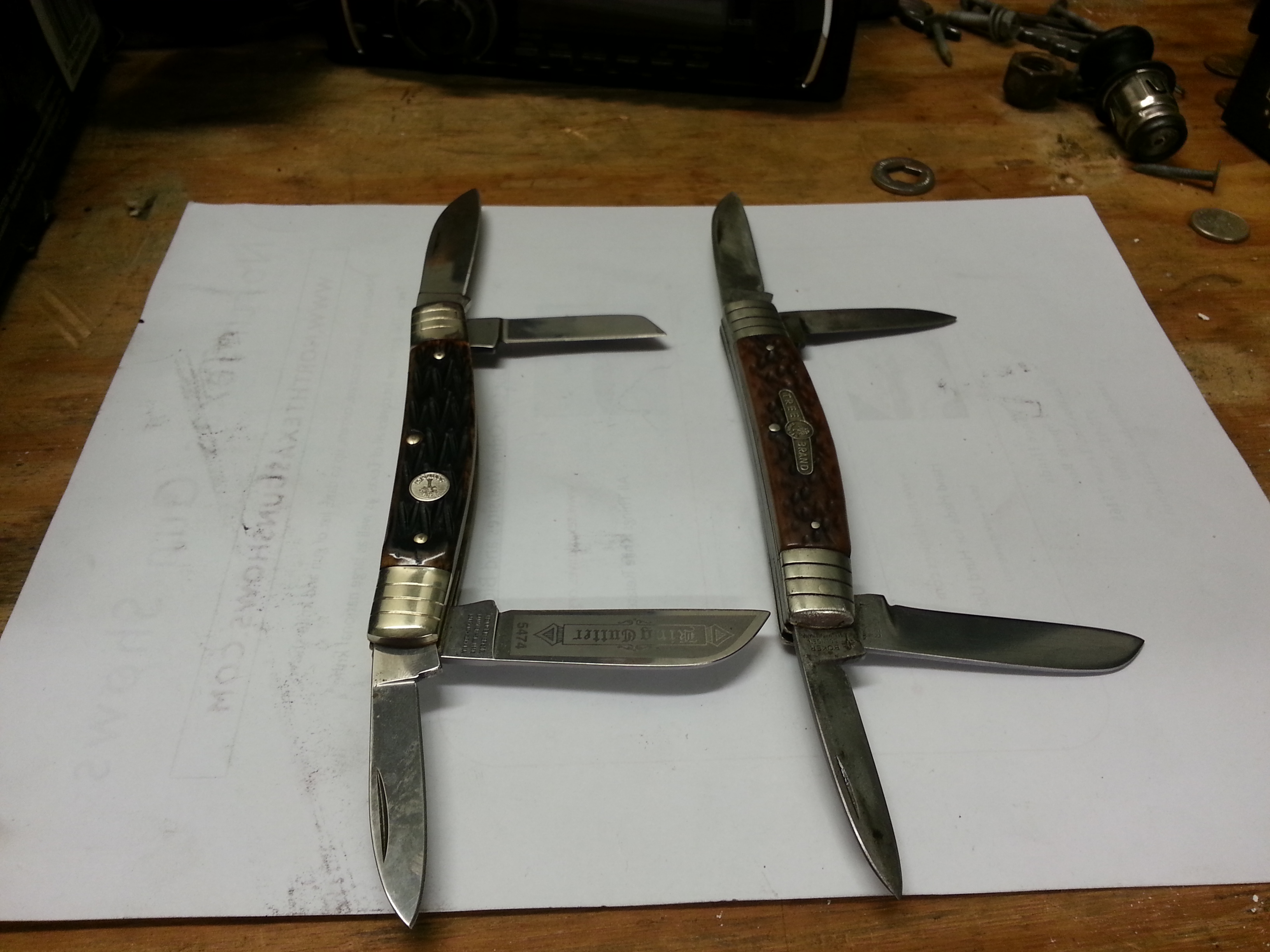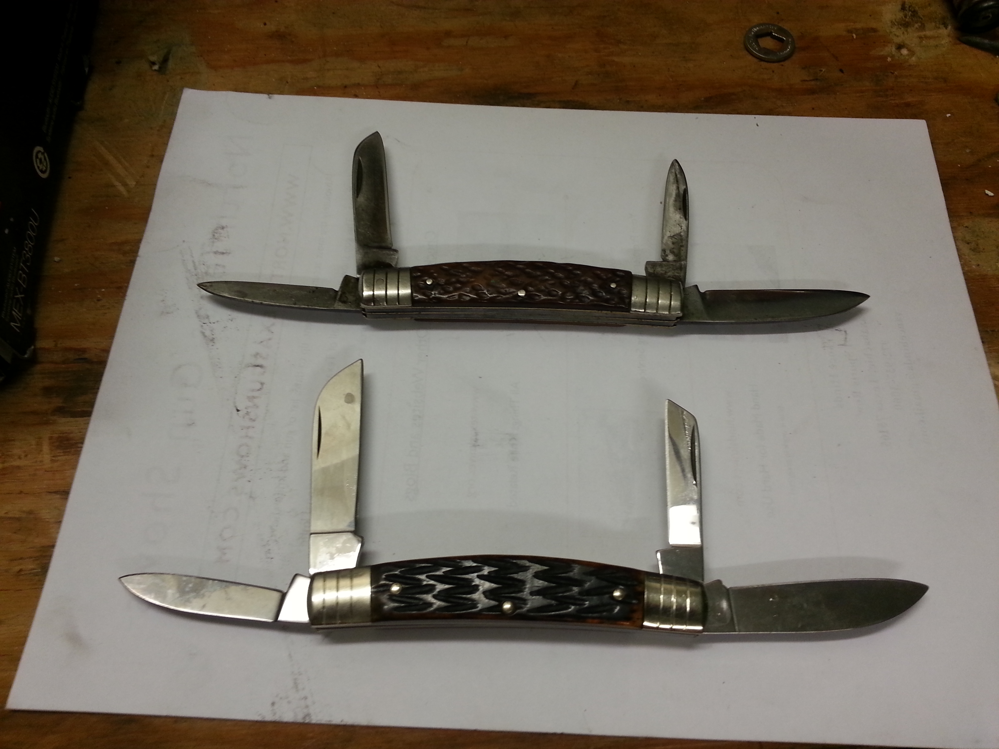 The apple never falls far from the tree. The old adage always seems to ring true. Last week I picked up a knife off of ebay that reminded me of a knife that my Dad often carried. A Boker large congress with jigged bone handles. I bid on the knife just on a whim and ended up winning the bid. I dug my Dad’s knife out of the safe and compared it to the new knife. I was right about the similarities. I showed my son Don his Granddad’s knife and the knife I just bought on Ebay. He loved Pop’s knife more than the new one. Don is named after my Dad, Don Hinds by the way. My son started cleaning the knife. He spent Sunday night hand sanding a blade by himself in the garage. Tonight he tried the buffer for the first time on the old congress. He said, “now this is fun hanging out in the garage and working on knives.” The apple and the tree.