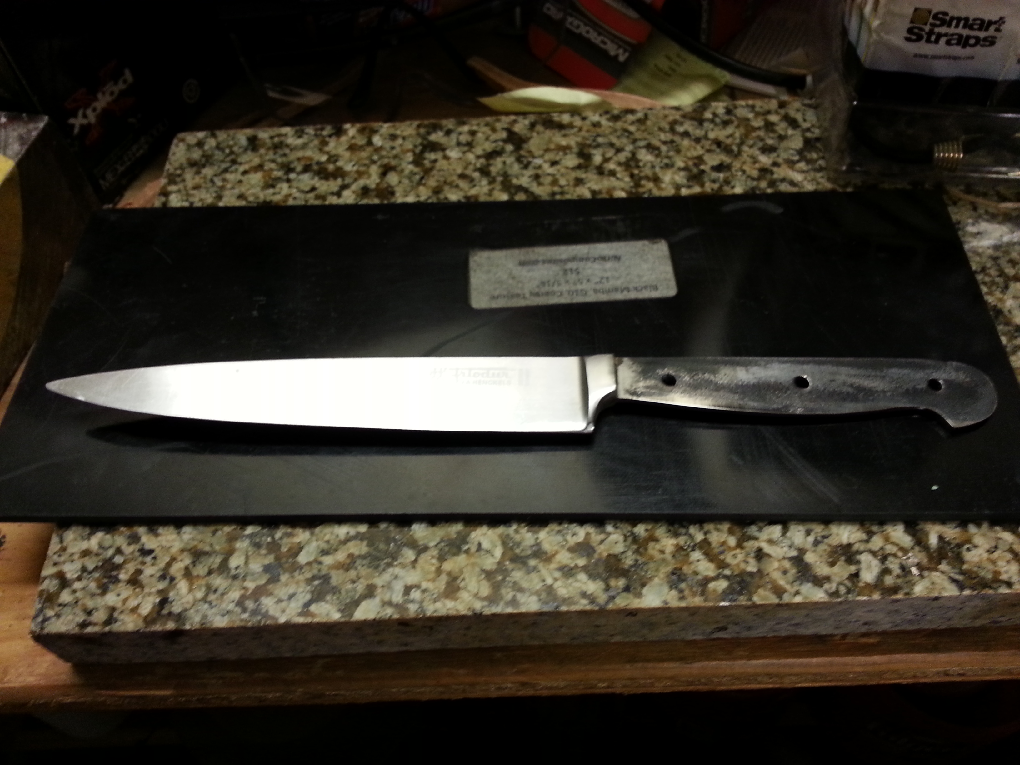 The above Henckel carving knife has seen many trips to the dishwasher. I was asked to replace the handle with an updated material. The handle material is G10 reinforced fiberglass. It makes excellent handle material. The old wood handle needs to be replaced.