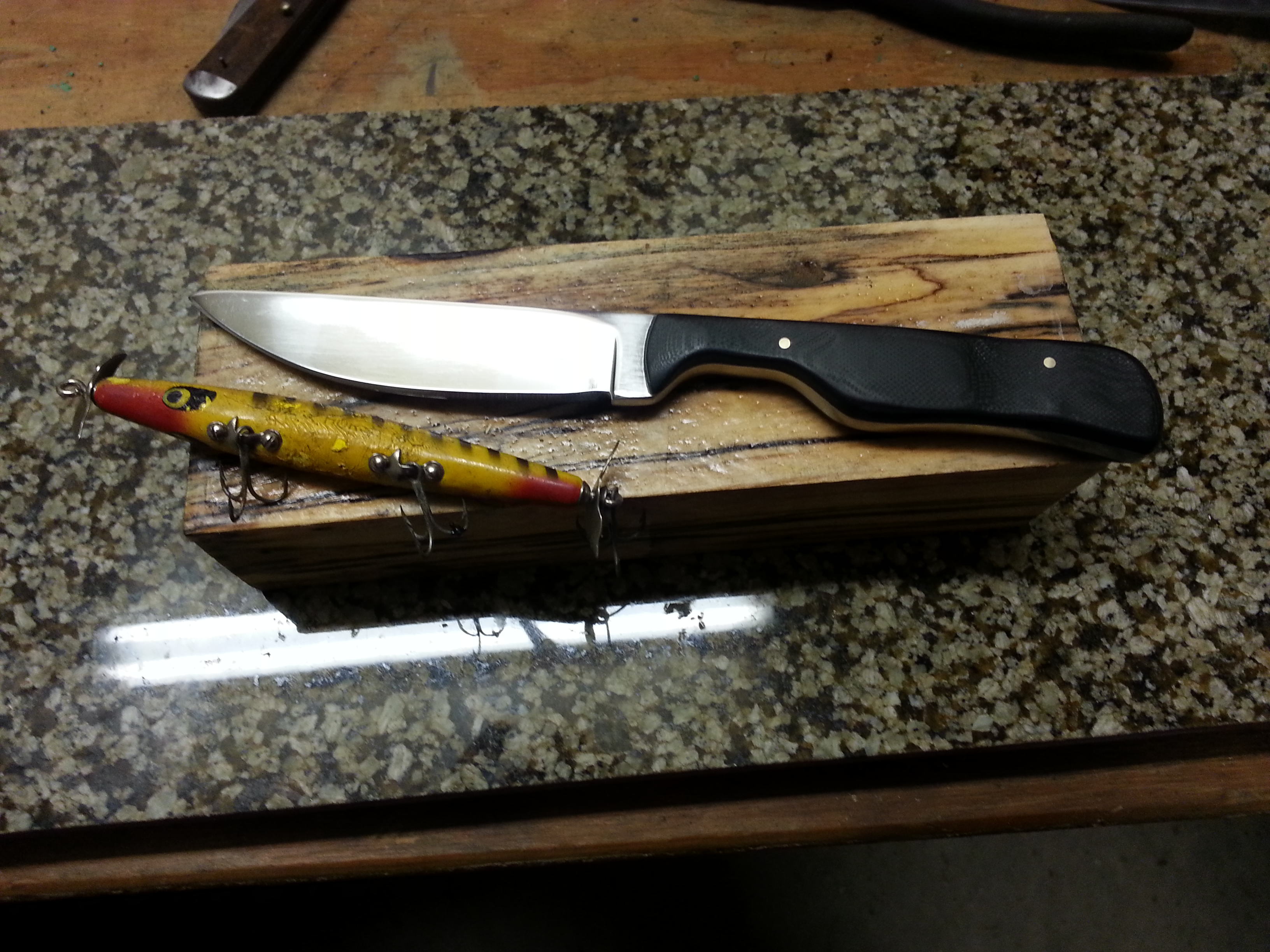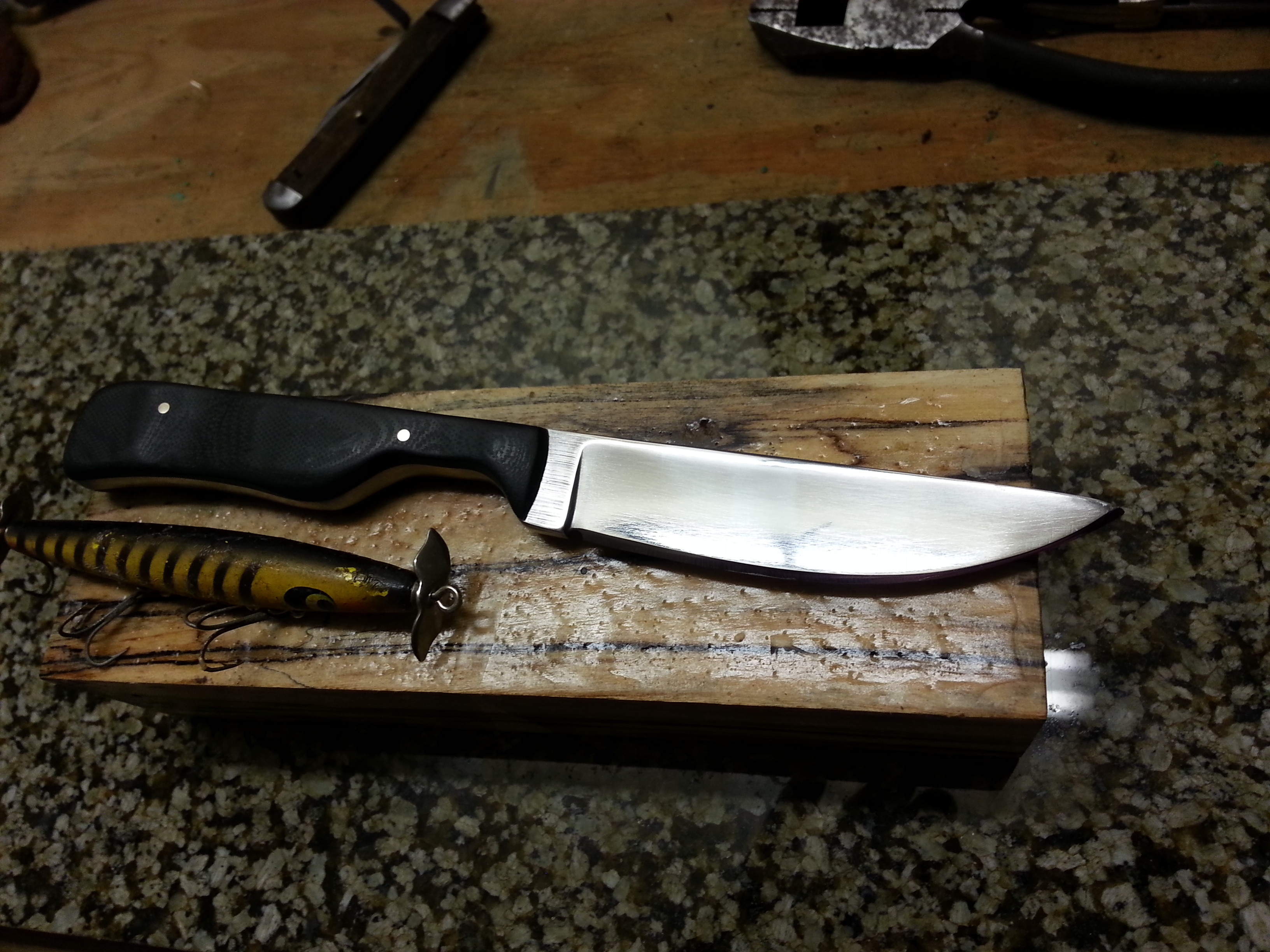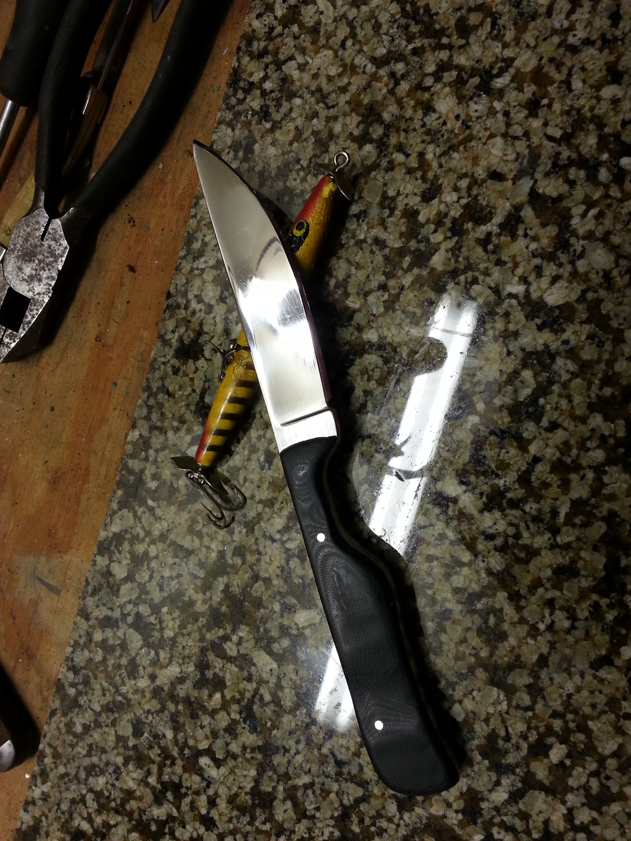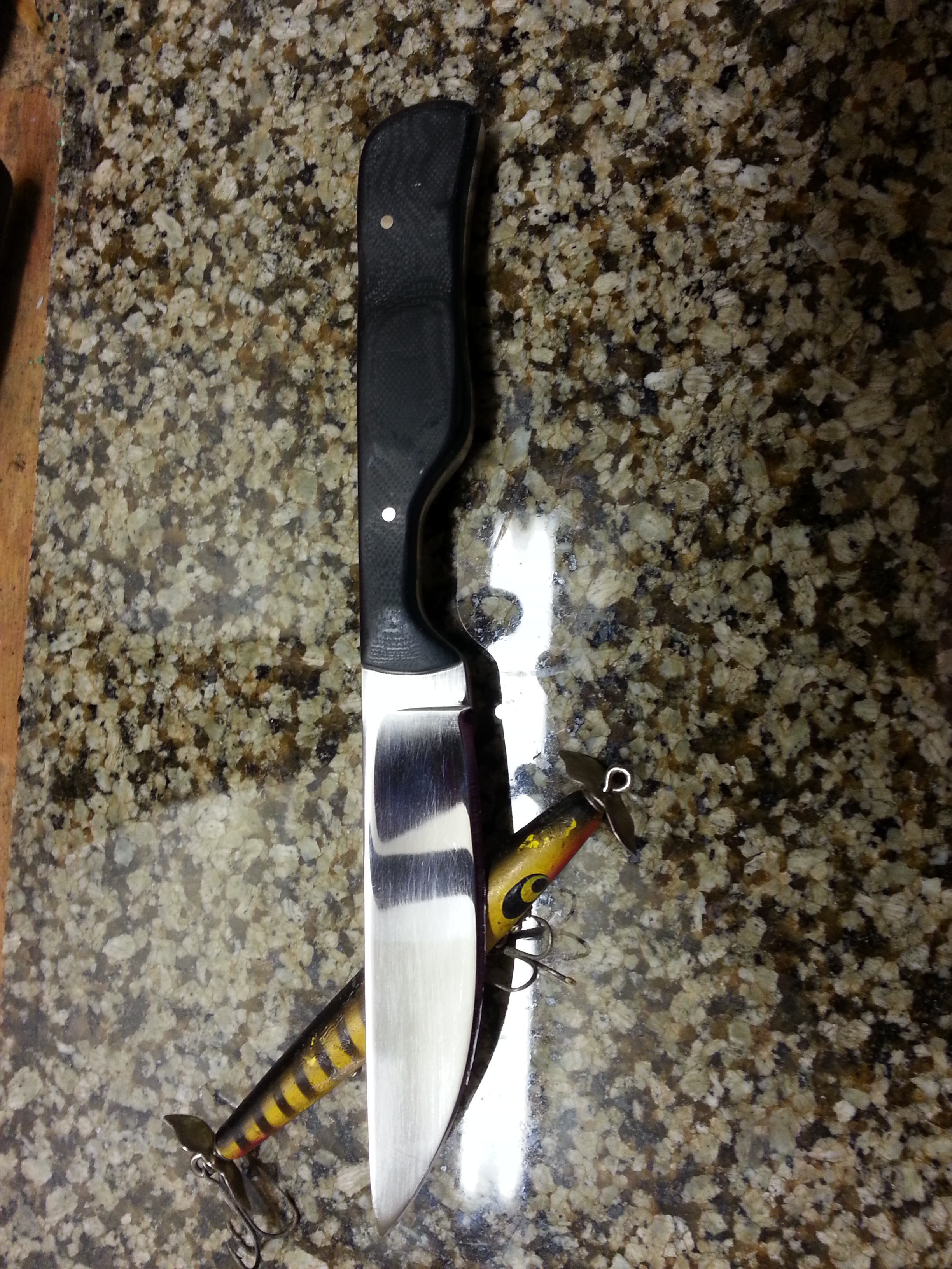 This is the first knife that I made from scratch, start to finish. It is a sole authorship piece. The blade steel is 1080 high carbon. The handle material is reinforced fiberglass/G10. The blade has a hollow grind with a mirror finish. It is a beautiful knife. Below is are photos of the making of the knife. Sold.