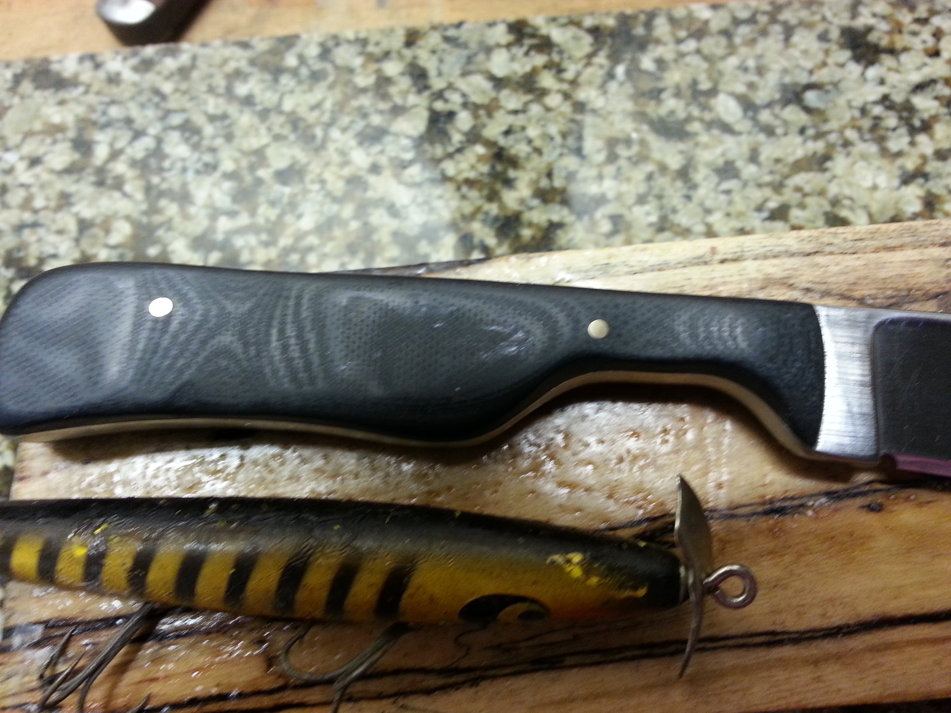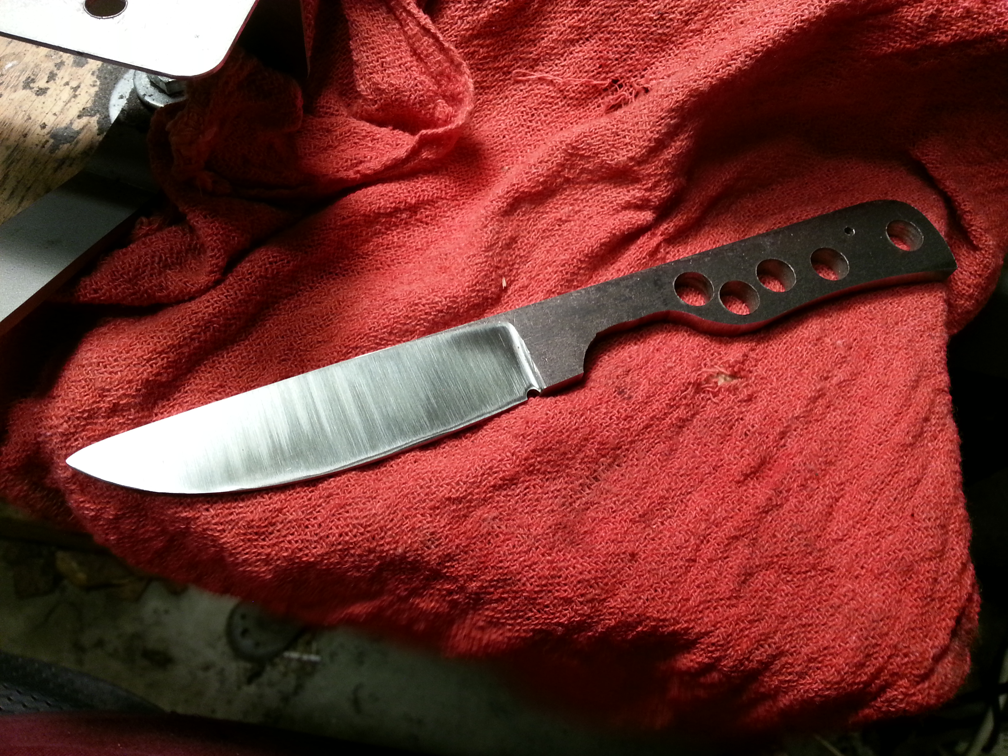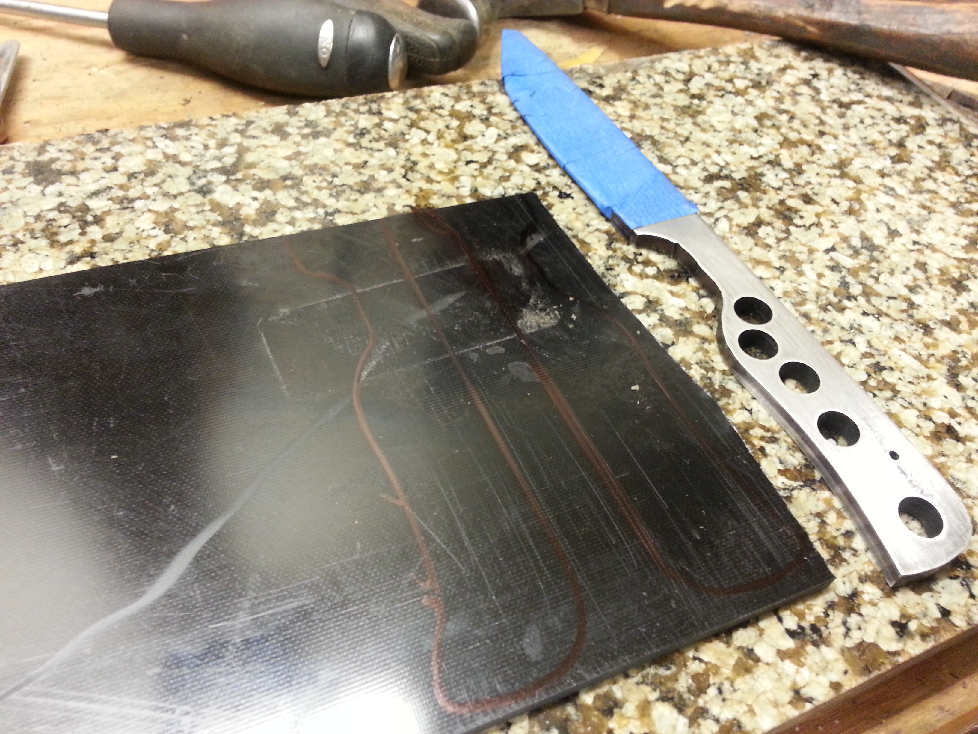 This is the first knife that I made from scratch, start to finish. It is a sole authorship piece. The blade steel is 1080 high carbon. The handle material is reinforced fiberglass/G10. The blade has a hollow grind with a mirror finish. It is a beautiful knife. Below is are photos of the making of the knife. Sold.