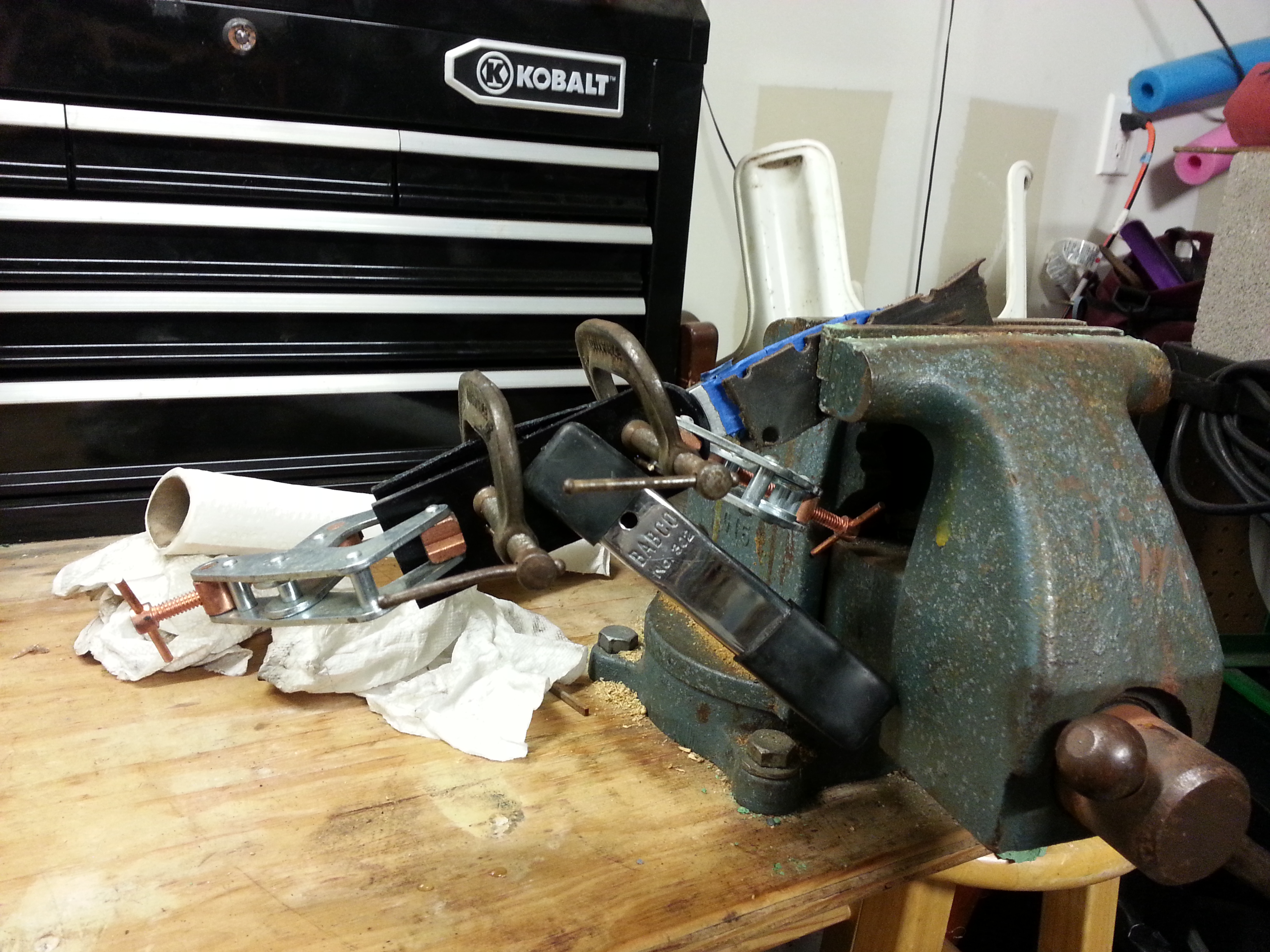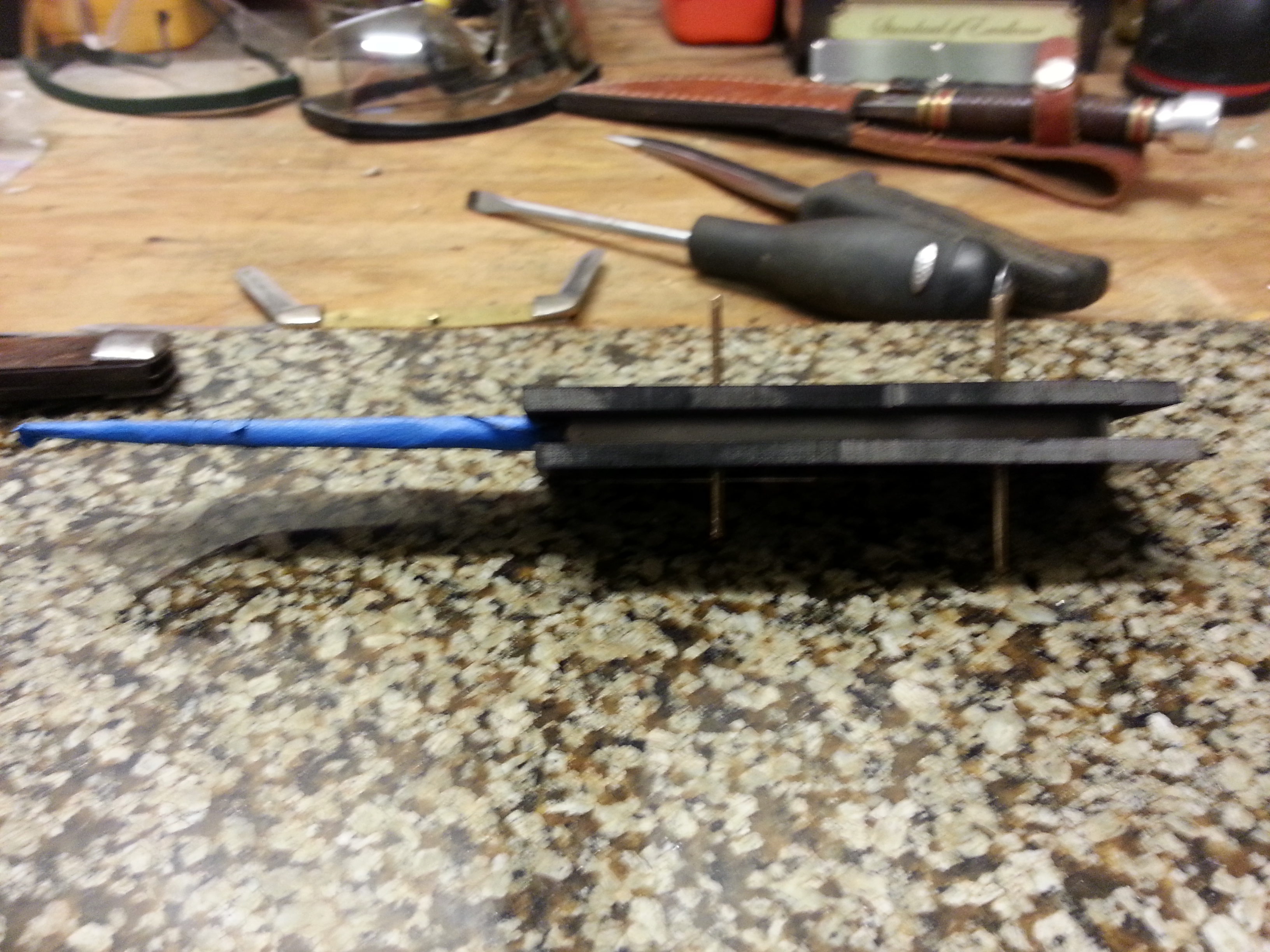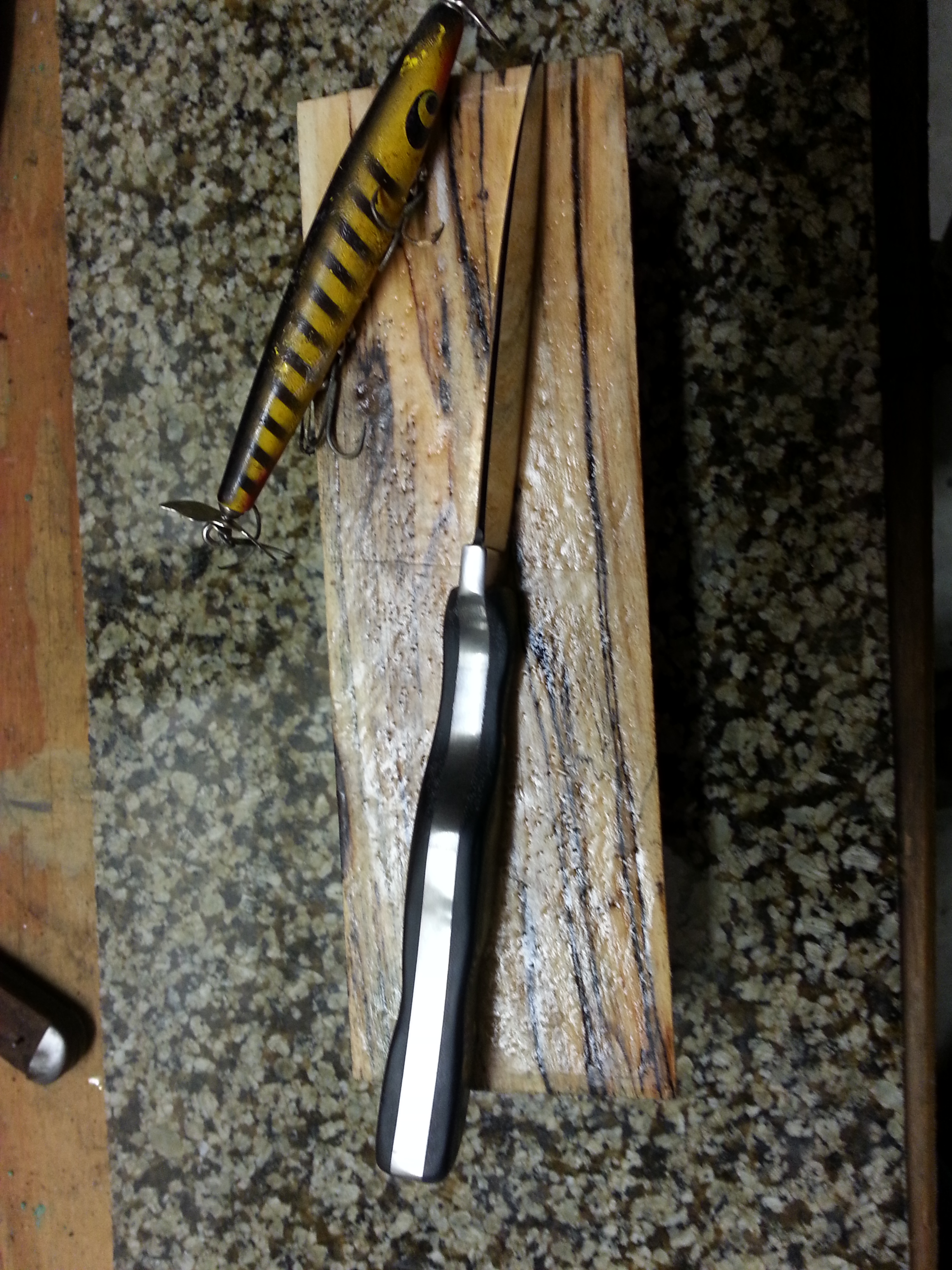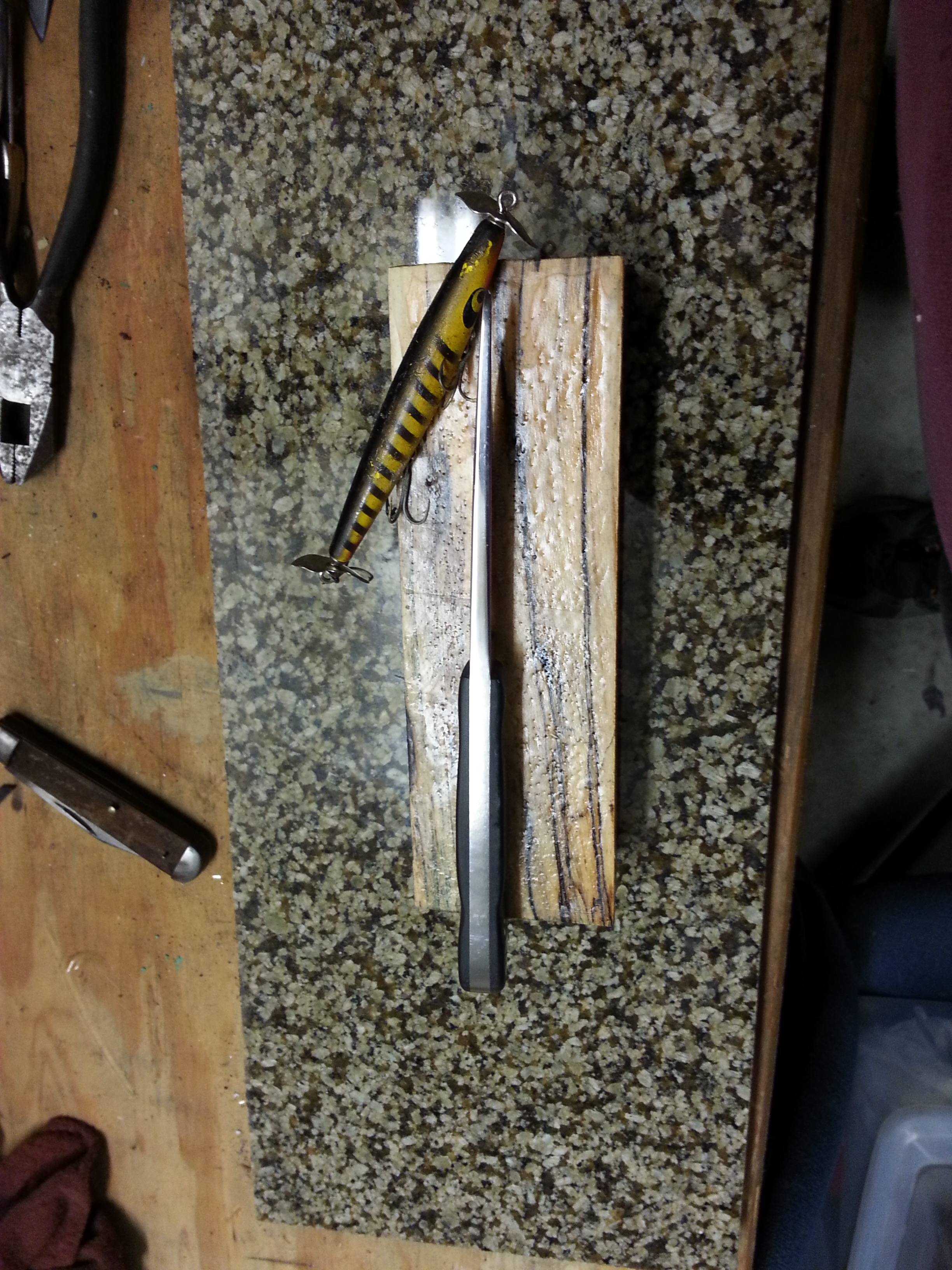 This is the first knife that I made from scratch, start to finish. It is a sole authorship piece. The blade steel is 1080 high carbon. The handle material is reinforced fiberglass/G10. The blade has a hollow grind with a mirror finish. It is a beautiful knife. Below is are photos of the making of the knife. Sold.