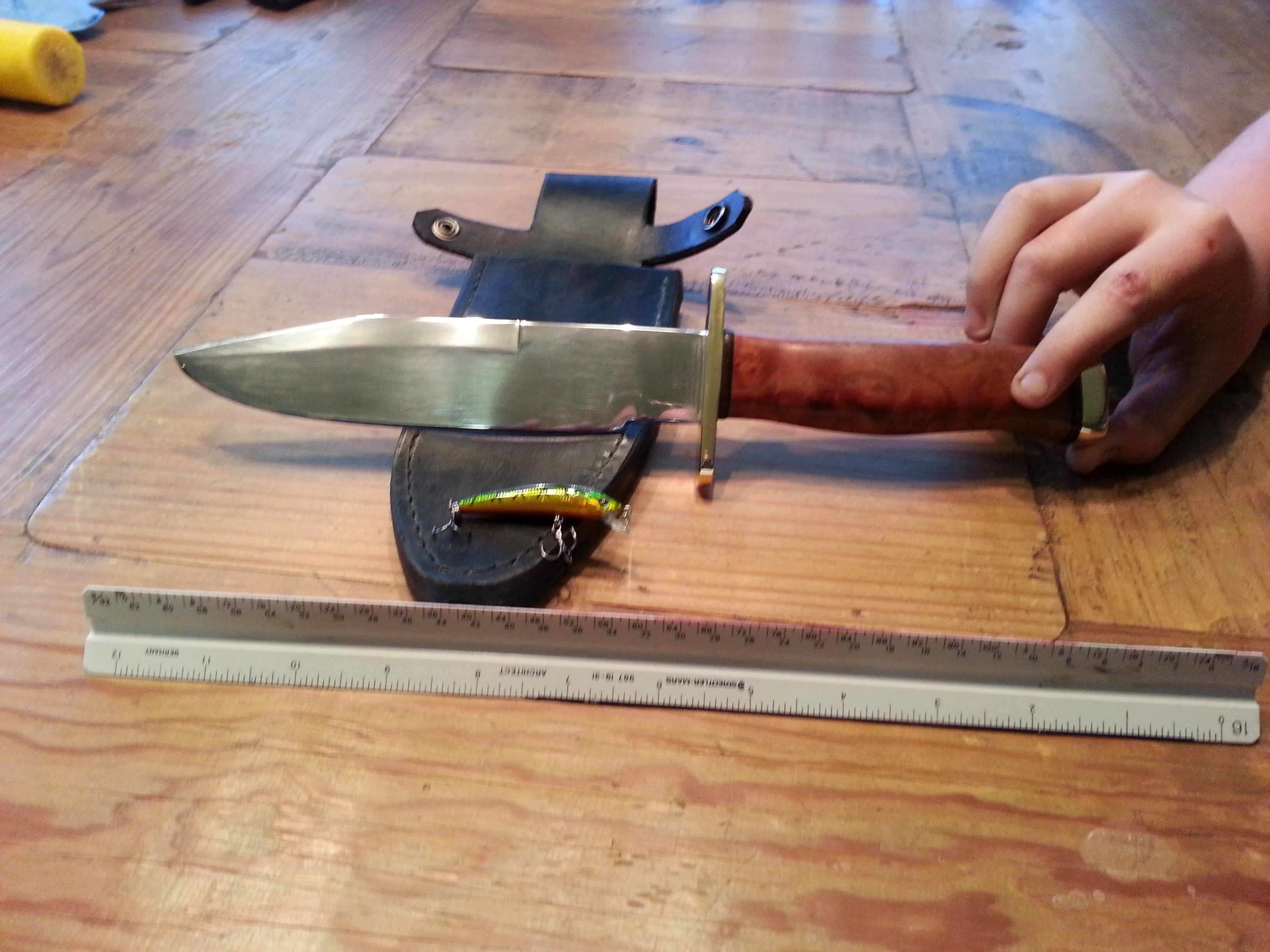 When asked by a local high school senior for a custom knife he can use to kill hogs, I thought I would look to Randall Made Knives for inspiration. I chose the Model 14 Attack on which to loosely base my hog killer. I went with 5160 as my choice for blade steel, triple quenched and triple tempered. It is outfitted with a brass guard and brass pommel. The handle is stabilized red dyed maple burl with leather and black vulcanized paper spacers. The sheath is custom fitted, hand stitched and died chocolate brown. The overall knife is 12.75 inches long. The blade is 7.5 inches and the handle is 5.25 inches long. The knife feels great in the hand. This is one beautiful knife.