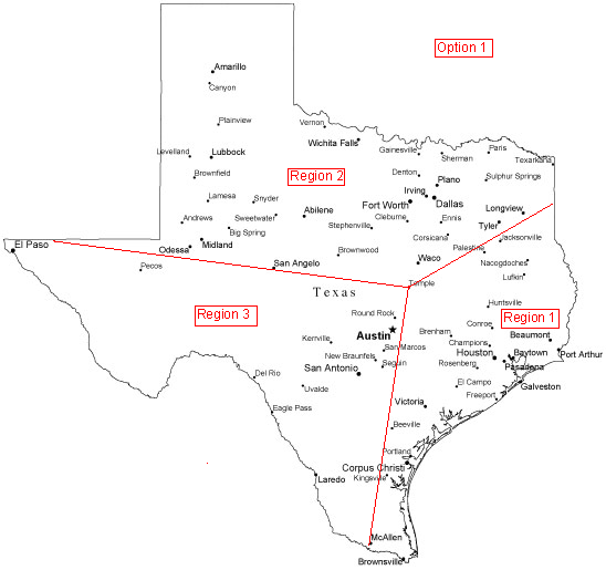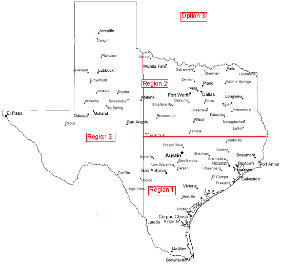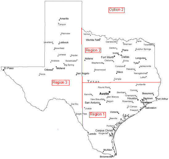 Below are 3 options for our regions map. Please vote on the option that you want for our regions map in the Texas Knifemakers Guild Group on facebook. VOTING CLOSES SUNDAY NIGHT AT 8:00 P.M., 11/9/14! Whichever region has the most votes at 8:00 p.m. tomorrow night wins. Region 2 is having a discussion Sunday night at 9:30 p.m., so we need something set by then so that Region 2 people can participate. Please remember that these regions nomimate the 5 board members from that region. The Board of Directors at the first meeting can change the regions. But the vote will determine the regions for selection to the initial Board of Directors. Also if near boundary line or out of state, you can select the region you are in. Only vote once. Vote by posting “Option ___” in the space below. Hopefully this will put the issue to rest until the Board of Directors meeting in January. Option 1 is my stab at the state. Option 2 follows the natural contours of the state and the design on the flag. Option 3 is a modified option 2 with Abilene staying with San Angelo.